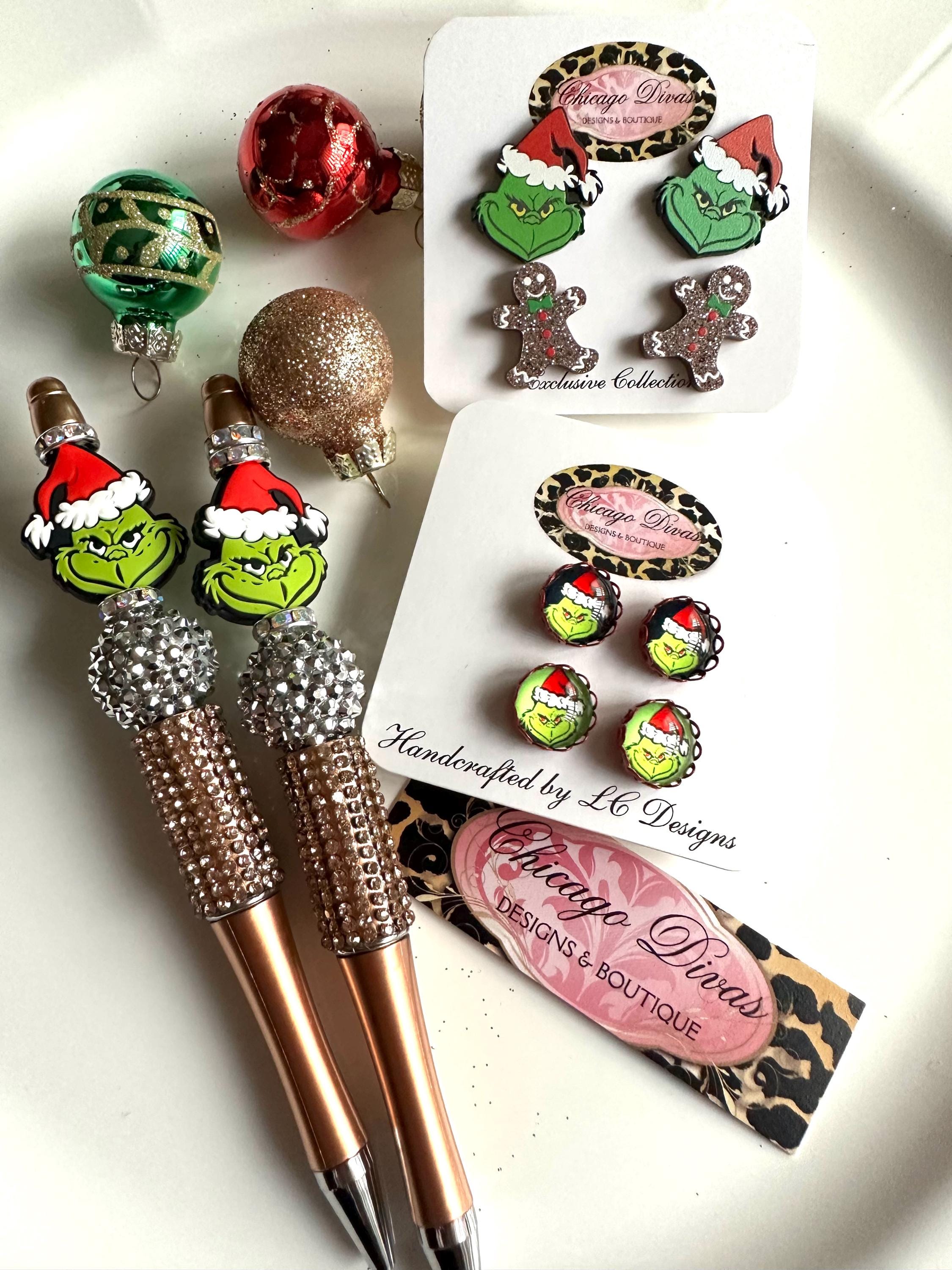 🎄🎄💫✨GRINCH SET. #4 pieces set. Grinch Christmas earrings. Grinch beaded pens. Christmas office. Christmas gifts. Stocking stuffers. Holidays 🌲💫💫 retractable pen. Black ink. Refill included. 🎄🎄 individually wrapped 🎄🎄⭐️💫 studs are 12mm diameter and 16mm diameter acrylic. Stainless steel base. 🎄🎄🎄 you will receive exactly the items in the picture 🎄🎄🎄⭐️💫 shipping USA 🇺🇸 only.