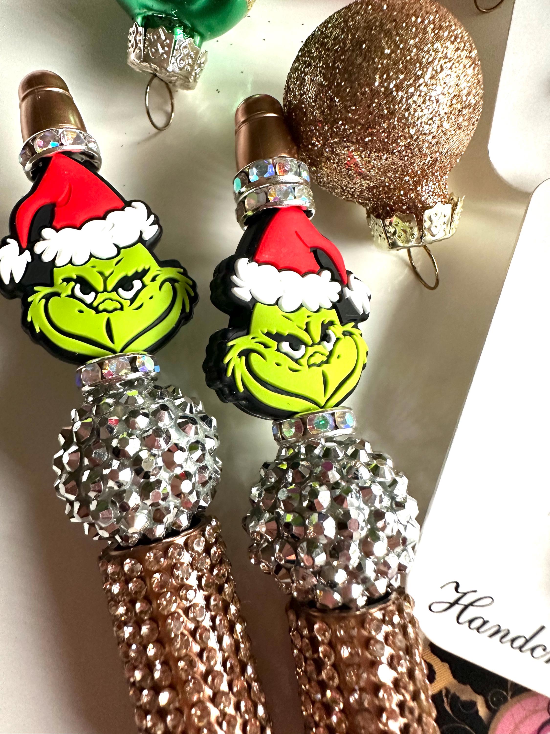 GRINCH SET. #4 pieces set. Grinch Christmas earrings. Grinch beaded pens. Christmas office. gifts. Stocking stuffers. Holidays